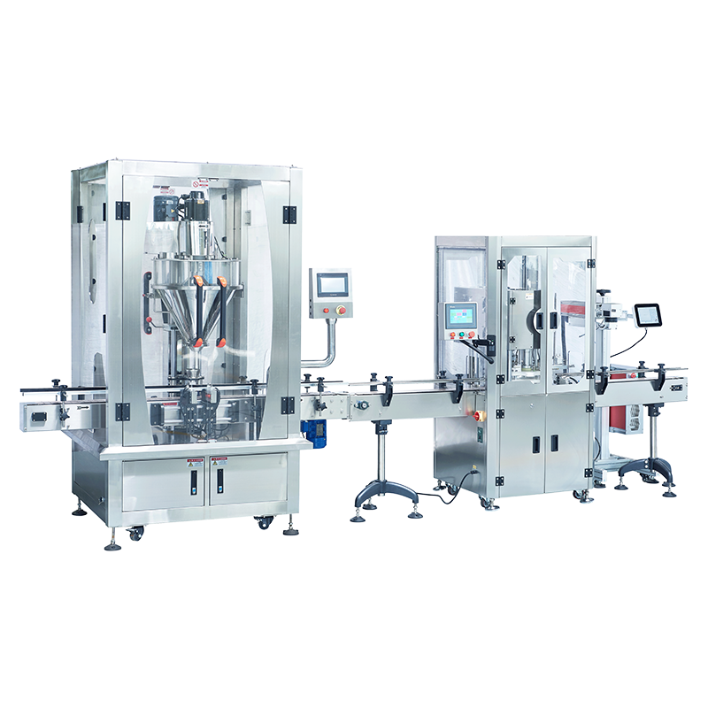 Powder Production Line - bottle unscrambler (accumulation table), can filling machine for powder, tin can sealing machine, capping machine, can labeler, finished bottle collection table.